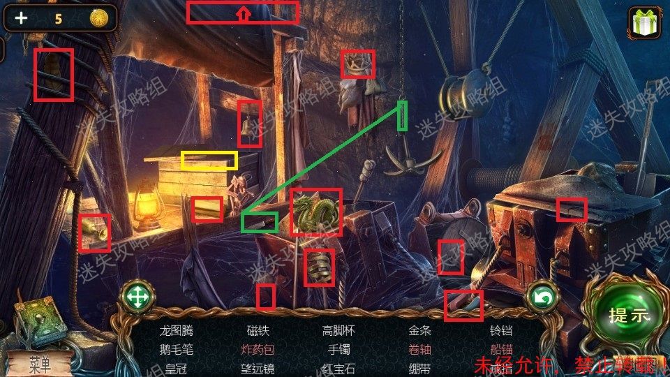 3.绿圈使用小刀割开绳子后得到船锚。小游戏完成后得到炸药(1)。52