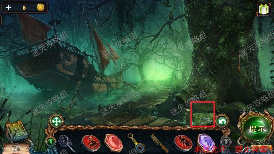 26、下图红圈处点击放大,对石头使用木棒,撬起石头后看见红色帆布上的船图案,点击记住线索。26