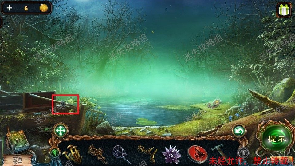 13、右侧红圈处点击放大,疯狂点击中间的树皮剥下,得到树皮(用来召唤河神的材料3)。黄圈点击放大后,对花上面飞舞的萤火虫使用捕虫网,得到萤火虫;同时点击左边的花拔出来,然后对根茎部位使用匕首,然后点击根,得到根须(用来召唤河神的材料4)。白圈处点击放大,对荷花使用匕首,得到紫菊(用来召唤河神的材料5)。篮圈点击,再点击箱子,进入小游戏。13