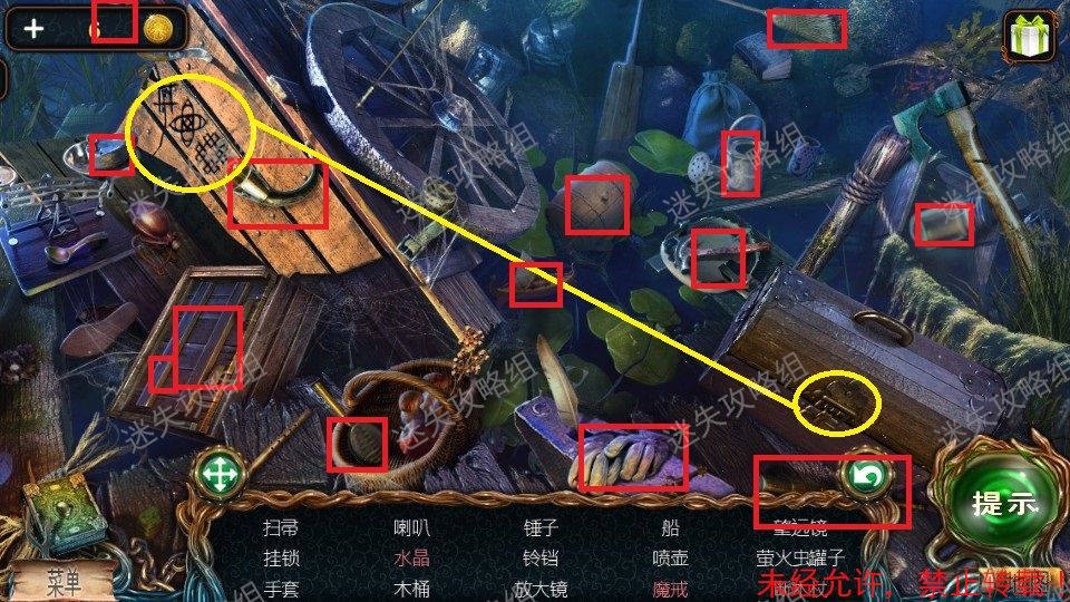 31、小游戏中黄圈部分为密码与密码箱打开后有一个物品。其它红圈全部圈出了各物品对应的位置(不一定是图片中显示,但位置正确)。完成小游戏后得到水晶。31