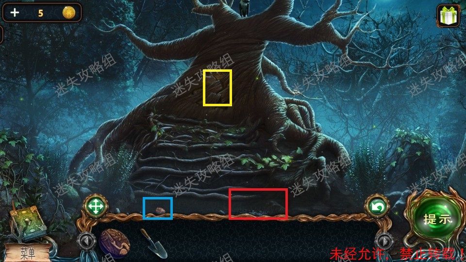 2、红圈点击使用铲子,得到木雕(2)。篮圈点击得到木雕(3)。黄圈点击剥开树皮放入三个木雕,小游戏。2
