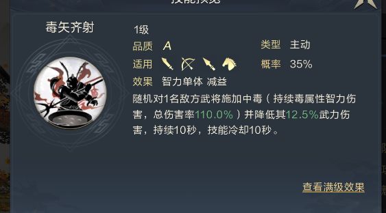 对随机1名敌方武将施加中毒状态(持续智力伤害,总伤害率1100%)并使其武力伤害降低12.5%,持续10秒,技能冷却10秒。