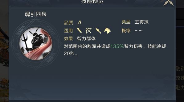 对范围内的敌方武将共造成1350%智力伤害,技能冷却20秒。