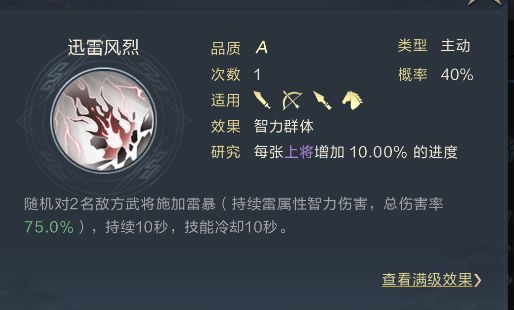 随机对2名敌方武将施加雷暴(持续智力伤害,总伤害率750%),持续10秒,技能冷却10秒。