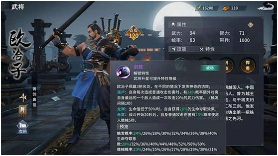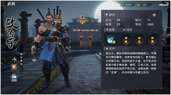 七雄纷争中欧冶子是资质120的橙色武将,游戏里的定位是拥有强大全场输出能力的战士步将。游戏中他的人物建模身后就背着五把自己铸造的名剑,同时他的特性剑技也和这些剑有着密切关系。解锁此特性的欧冶子将会佩戴三把自己铸造的名剑,分别是湛卢,龙渊,赤霄,每把剑都对应着不同的战斗属性。湛卢是给欧冶子增加武力伤害,龙渊是当欧冶子生命值过低时给予他生命夺取效果,而赤霄则是在战斗中有几率让敌人缴械,这三把剑使得欧冶子兼具输出、防护、战术三种能力,所以是非常值得培养的后期武将。