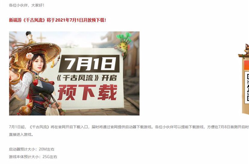 7月1日起,《千古风流》将在官网开启下载入口,届时将通过官网提供启动器下载游戏。