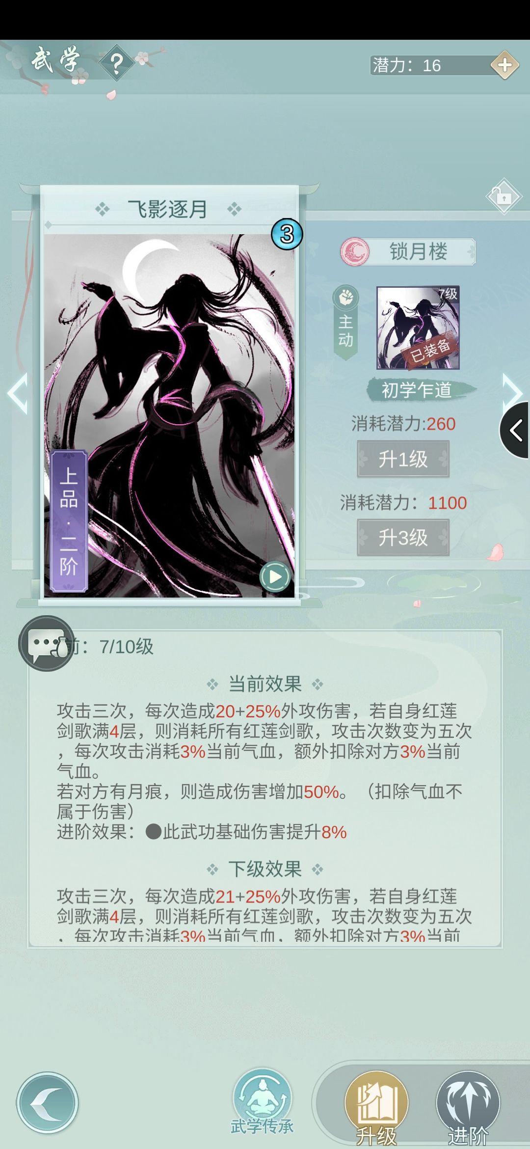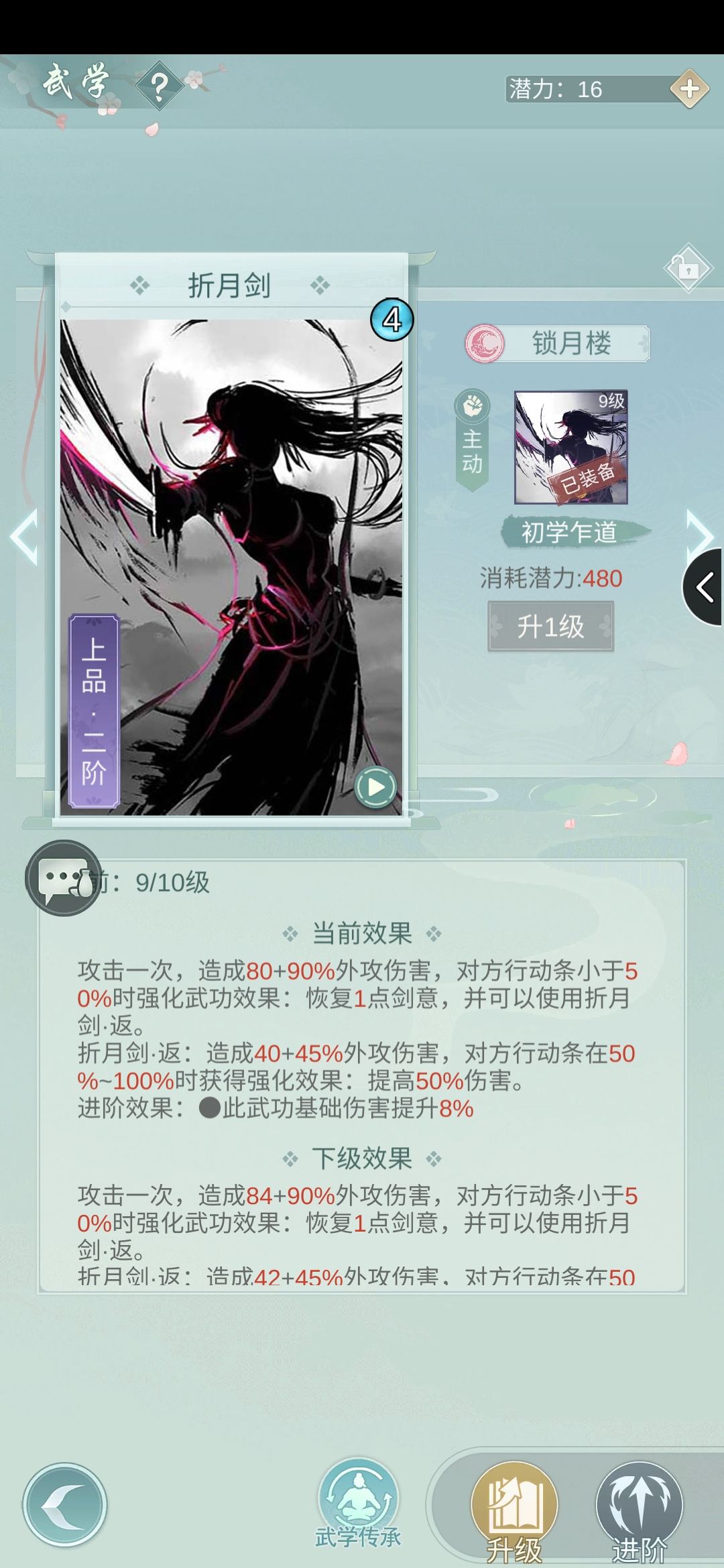 锁月主要升级剑招,因为是外功门派,最好配无锋,因为要看对方行动条释放技能,属于后手进攻,且自身技能消耗剑意很少。(配上技能图)