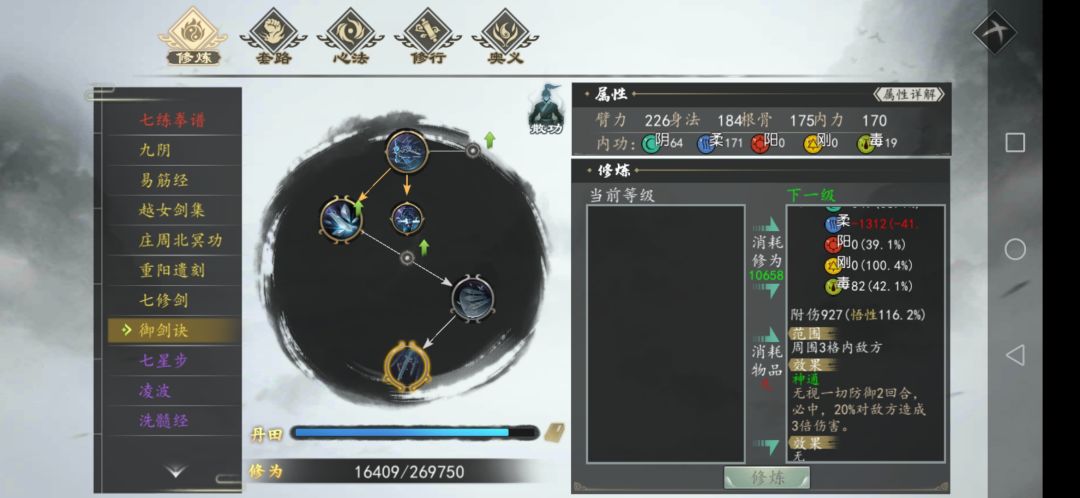 这御剑诀强的过分了啊?都不考虑武学平衡性的吗?别的同等橙色武学都弱得一批,你这却强出天际了,自带无视必中还三倍伤害,乾坤斗传还免疫负面,还有一个加强版剑意四方消散,带上龙象就是剑剑双倍伤害,这刚剑不修改npc都没活路了。