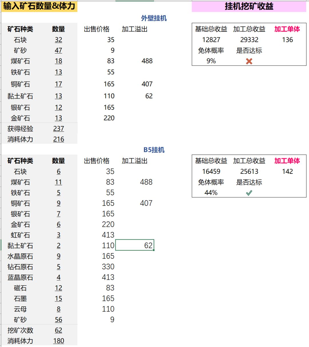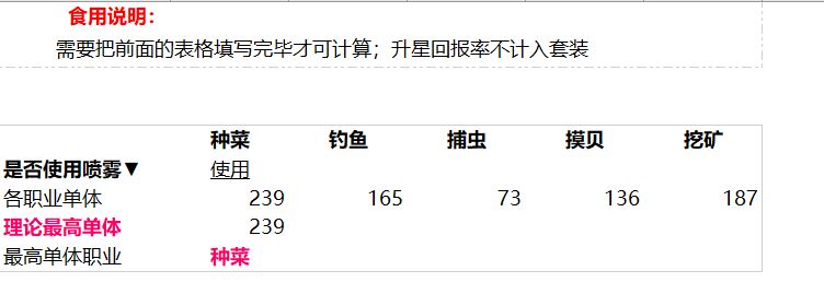 截了几张示意图,对算法不感兴趣的按需求填写橙黄色有下划线的部分,然后看粉红色部分的结论就可以了。具体算法在表格另外的部分可以查看,也没有用很多复杂的公式,就是满足了列表查找的功能,所以玩家只用根据自己的熟练度、工具等情况还有使用时候的版本的市场买入卖出价填写初始值,结论就会发生变化了。