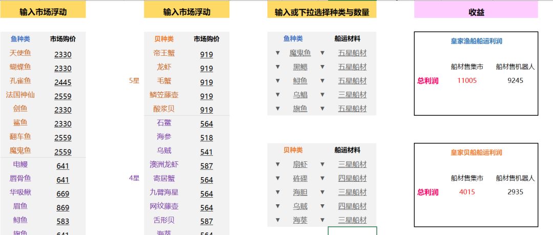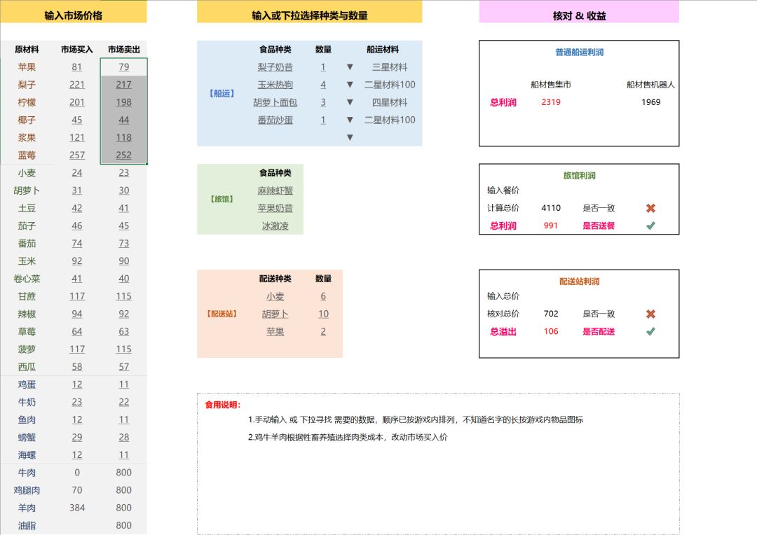 表格基本涵盖了悠长各种各样的收益算法啦,可以按照自己的工具星级和套装等进行选择,这样就不用到处找不同的攻略了,版本更替的时候改动原材料价格就好啦。