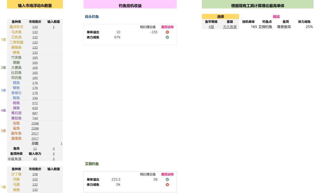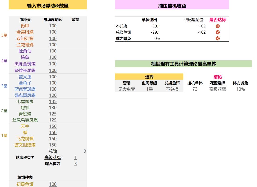 虫:理论单体算法部分会根据收益推荐花蜜选择;鱼:分了两个钓鱼点,理论单体也会根据收益推荐鱼饵和挂机点选择;贝、矿:得到单体收益。(鱼虫贝用的官方数值算的理论单体,矿自己测了7次,不一定准确。)