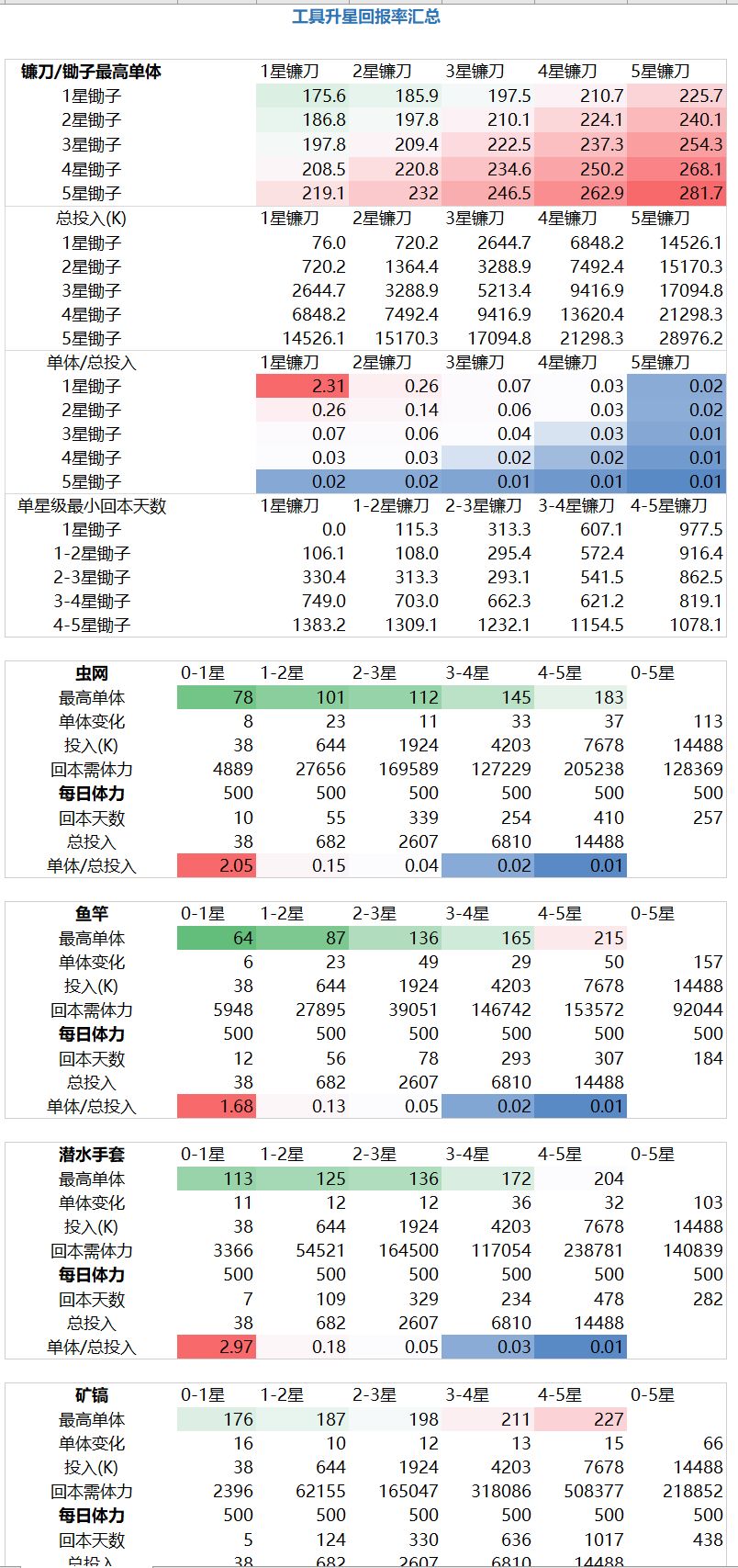 7. 各工具升星回报率:会随着版本更替各种原材料价格变动发生变化。