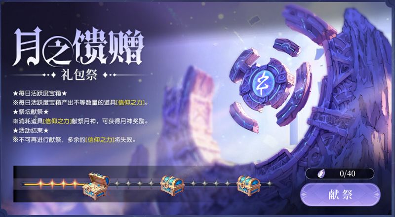 月神也为各位玩家们准备了礼包与奖励,完成每日任务,即可从每日活跃度宝箱中获取信仰之力,在祭坛中将信仰之力献祭给月神,即可获取月神的奖励。