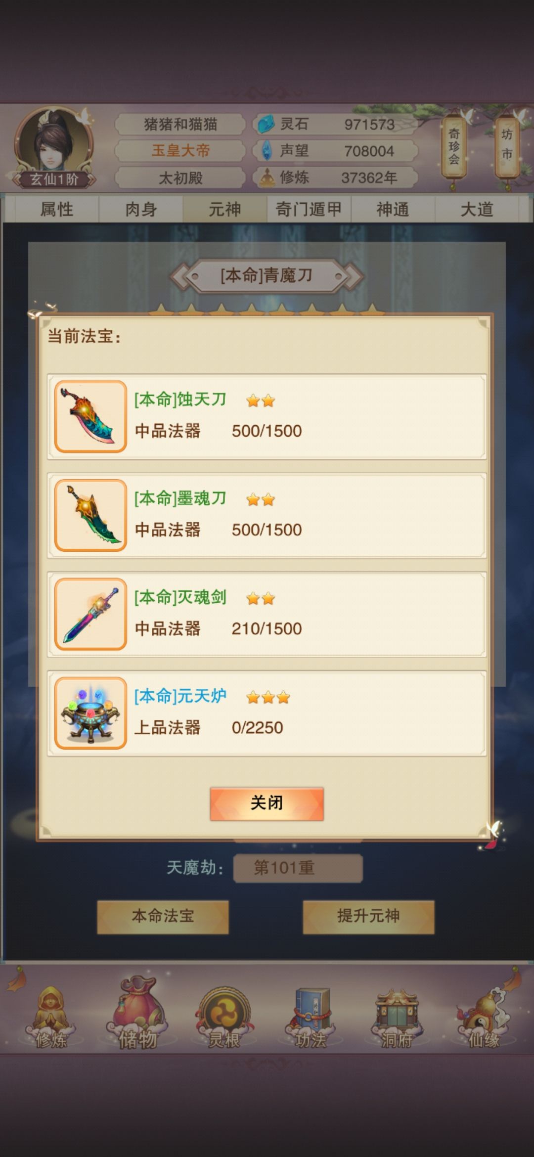 论坛找了一圈没发现确凿的元天炉使用方法。今天试验了下。只要需要加经验的本命在背包使用进入元神这个界面的那一刻,元天炉是装备在第二本命的位置就可以,不需要炼制的时候装备元天炉。