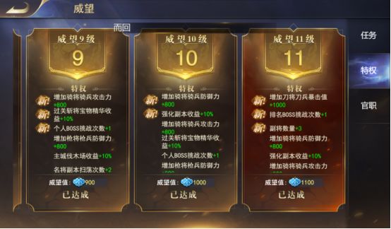 4. 当然,每级的威望还对应着不同的特权,每次升级都可以获得新的特权,什么兵种属性,建筑收益,挑战次数什么的拿到手软。