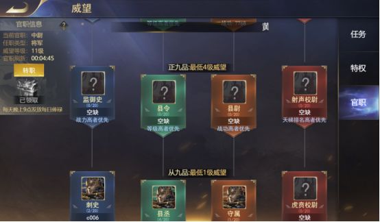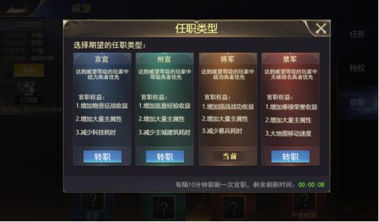 2. 官职中一共有4个任职类型,除了硬性的威望等级条件以外,每个类型的官员还有自己的优先选拔原则,比如说禁军就是天梯排位高的优先,而在将军类型就是战功高者优先。所以选择官职类型要结合自己的实际,喜欢打攻城战的肯定选择将军类型的更容易升迁了,要是喜欢混竞技场的玩家当然首选禁军了,当然也不用太过慎重,要是觉得目前选择的官职类型不适合自己也可以转职。