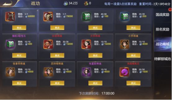 1. 攻城战最大的收益就是战功,每次击杀一队敌军或者是损失了一部分兵力都会获得战功,对,没有看错,自己损失部队也是会获得战功的。拿了战功可以去战功商城买道具。战功商城里的都是好东西,比如红将碎片啊,各种材料啊,让人眼花缭乱,恨不得全买掉。