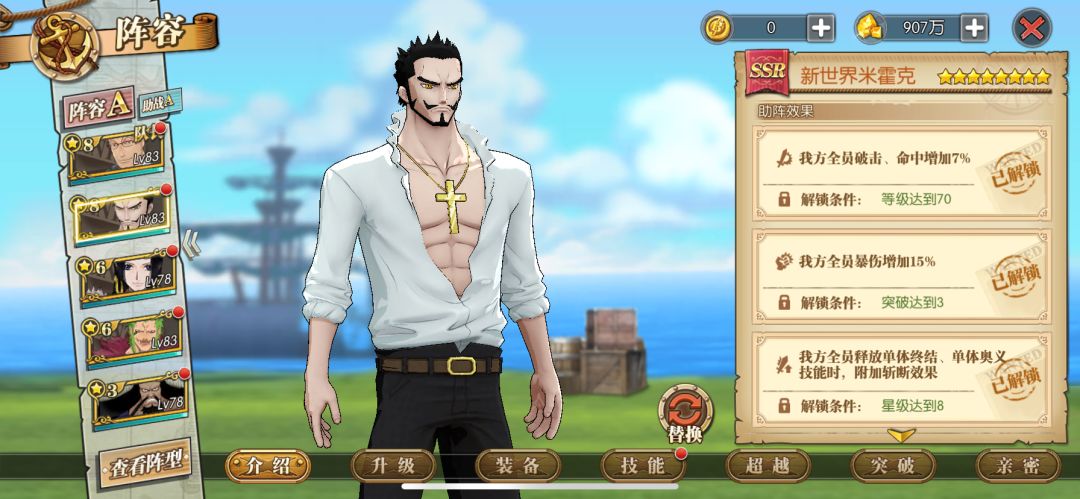 下面看看新鹰眼的助战效果:我个人看来的话,目前新鹰眼就是不会去到助战位置的,但不保证以后不会,毕竟现在游戏就这样子,一代新卡一代神。国家队换的非常快。新鹰眼的助战效果也是挺不错的,加命中,加爆伤,最后的八星助战效果对一些专门打单体伤害的卡有非常大的帮助,例如:锦卫门、新世界豹子、红发等等。