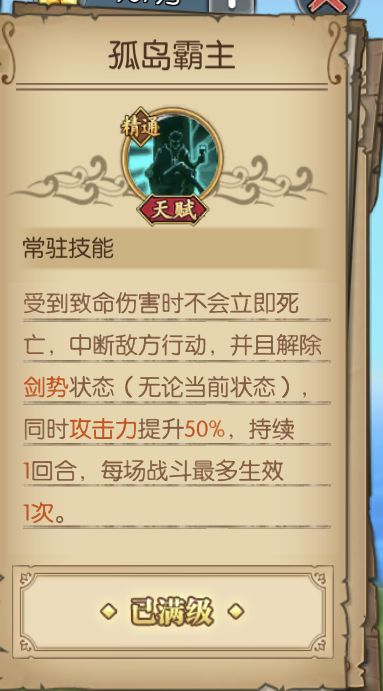 主要生存天赋:弱点洞悉与孤岛霸主(简单说第一个天赋可以中断敌人攻击并增加一回合出手机会进行反击,第二个天赋就是复活然后中断对方攻击并增加攻击力)