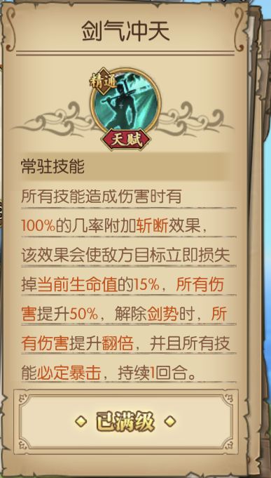 主要输出天赋:剑气冲天(简单说就让技能增加了斩断效果和解除了举剑状态然后就会增加伤害)