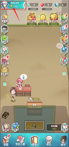 前期的主要玩法是玩家在教室中,通过挂机来获得大量资源(学费、心得),从而为学校逐步发展提供支持。