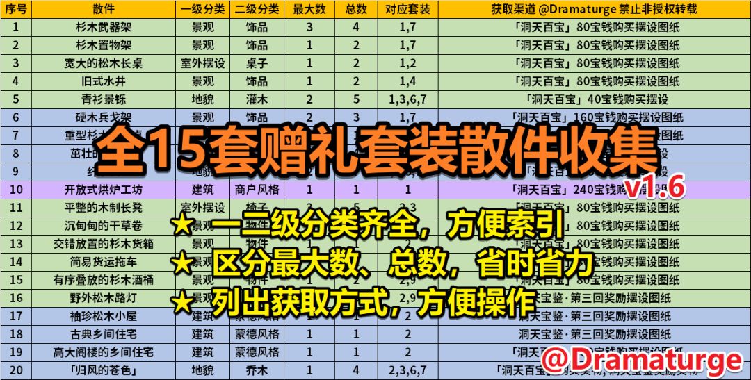 本文做出的工作是将所有赠礼套装的组成摆设整理成一张大表,照着表格收集摆设,即可一次性摆出所有赠礼套装。