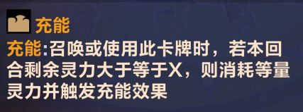 在召唤或使用拥有充能效果的卡牌时,若本回合剩余灵力大于等于卡牌上描述的充能数字,则消耗等量灵力触发充能效果,且只有充能独有,在放上卡牌后会显示充能所需数字,若剩余灵力不符,图标则会显示红色。