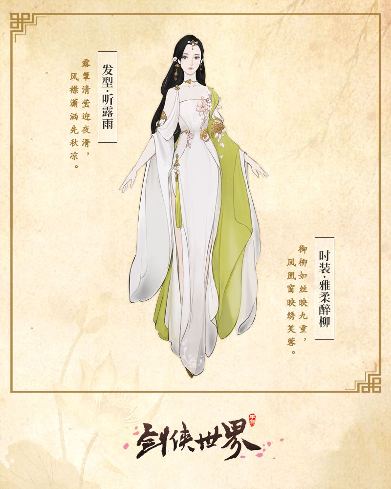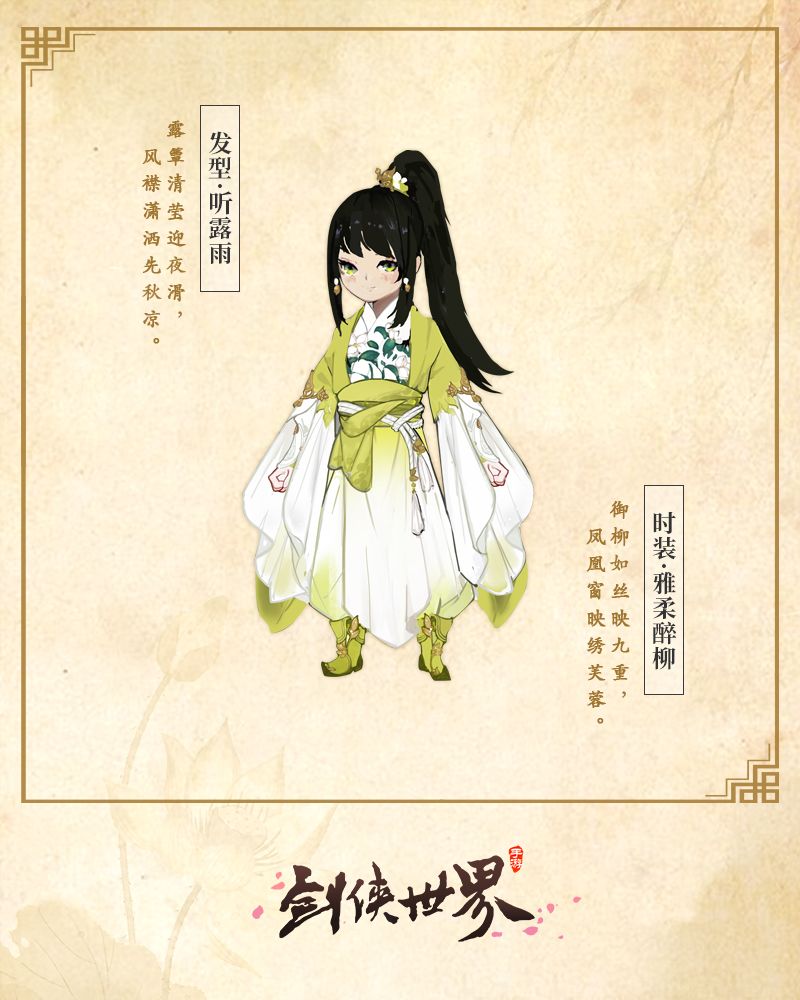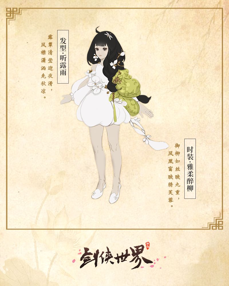 全新【时装·雅柔醉柳】以素净白和清新绿为主色调,炎炎夏日带来沁人心脾之感。新发型【听露雨】搭配其中也显得恰到好处。