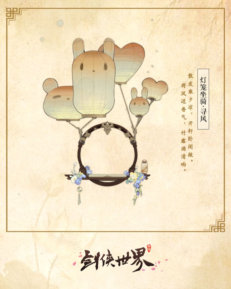 风铃花开,也带来了夏的讯息。特效坐骑 · 寻风以呆萌的小动物灯笼为主题,配以风铃花缠绕底部平台,蝶蝶飞于花间,少侠可以在享受花香的同时,欣赏江湖美景~