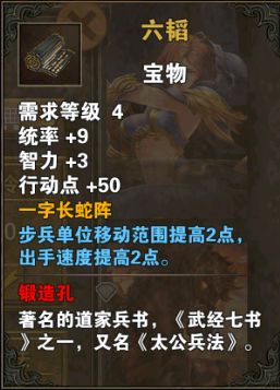 这两件宝物有人说同名的两件叠加装备后行动点无法叠加,这种说法其实是错误的。以六韬为例,装备后统御、智力、行动点这些属性点数值会对人物面板数据产生变化的,因此,此类数据是支持叠加的。再看看一字长蛇阵和西凉铁骑特效,一个是提升兵种能力的,一个是升级兵种的。亲测两个同名的六韬一起装备后,步兵单位的特效也不能提高4点移动范围,4点出手速度,实则特效只生效一件。同理,两个铁骑令也不会将重骑兵升级两次。