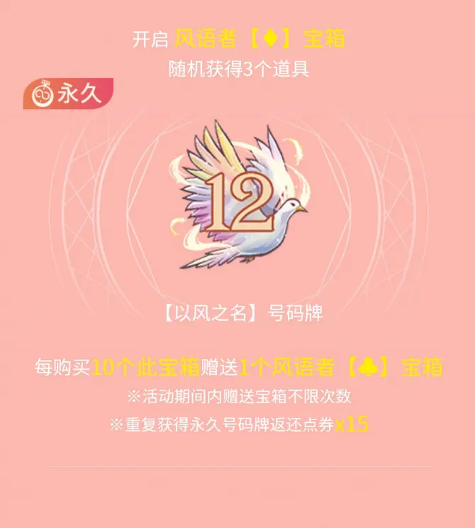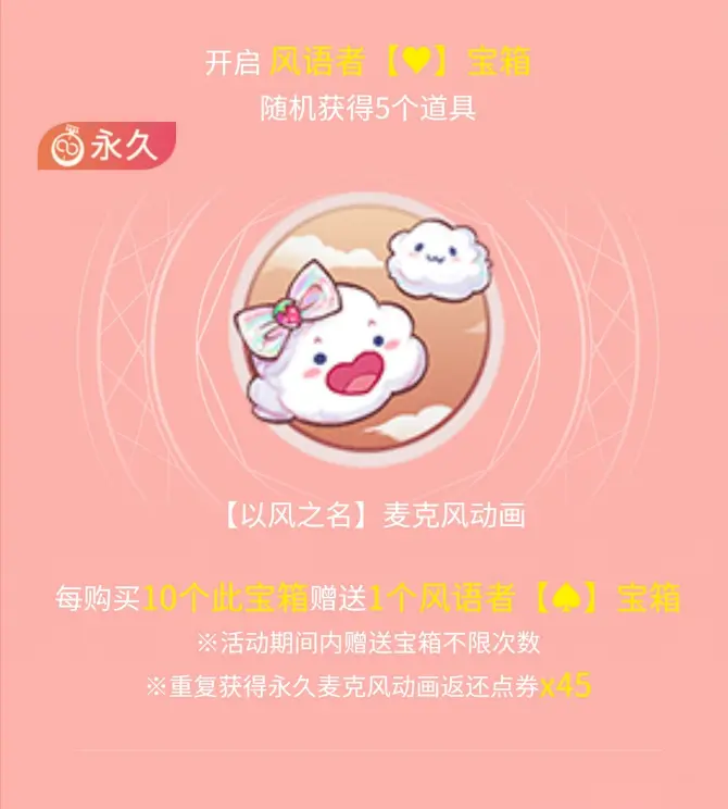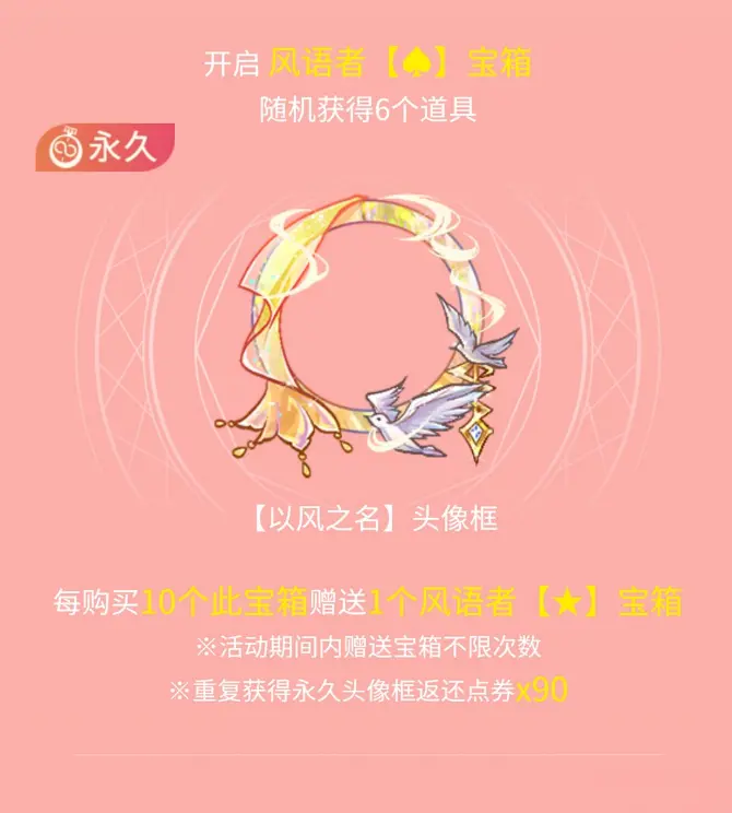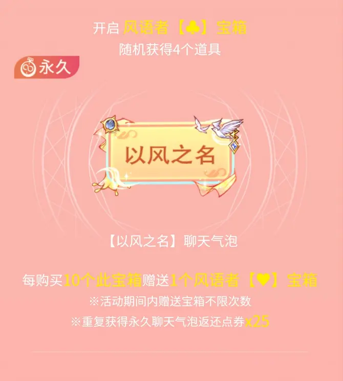 6月10日5:00~7月8日5:00活动期间,开箱有机会得以风之名套装,更多活动详情请于游戏页面查看。