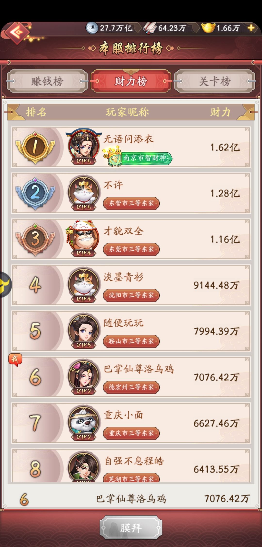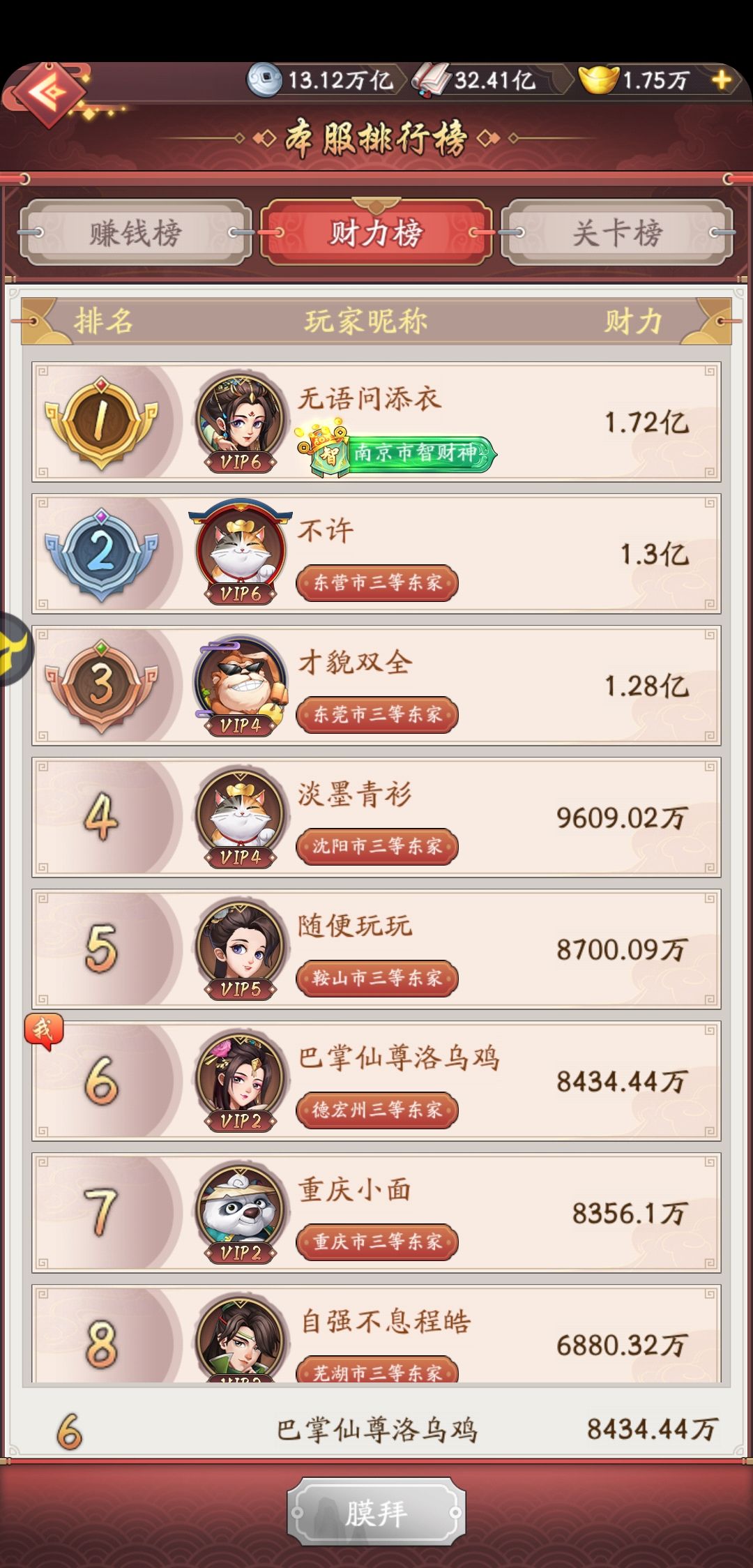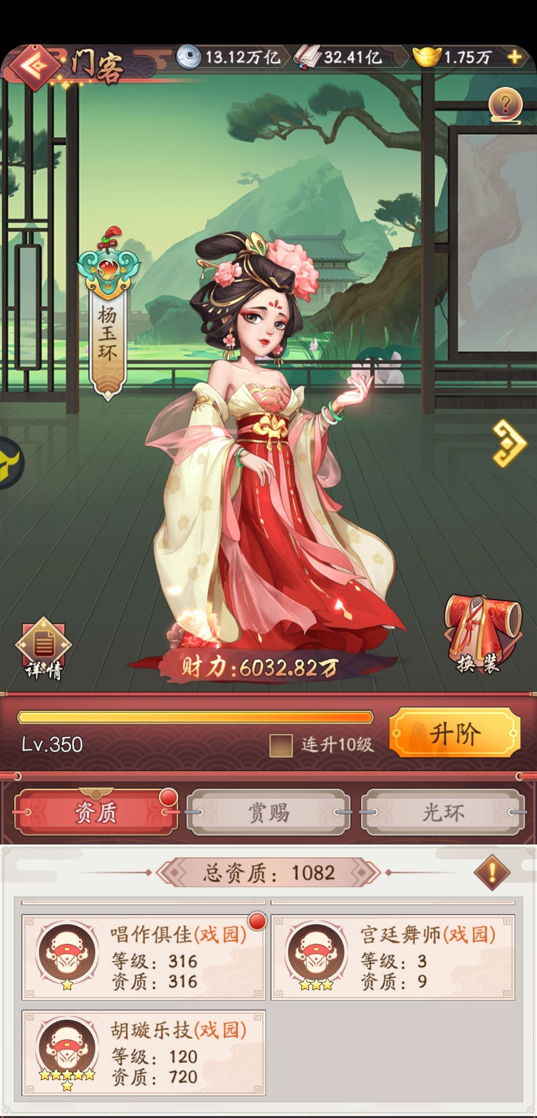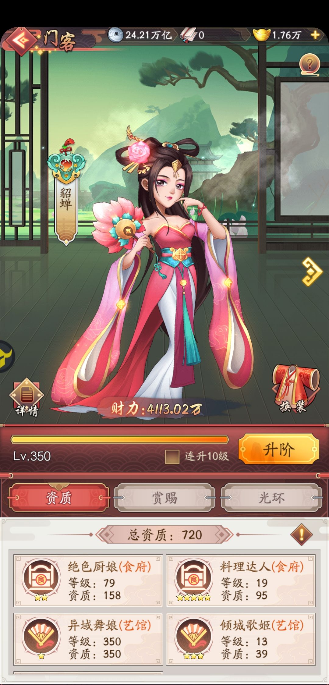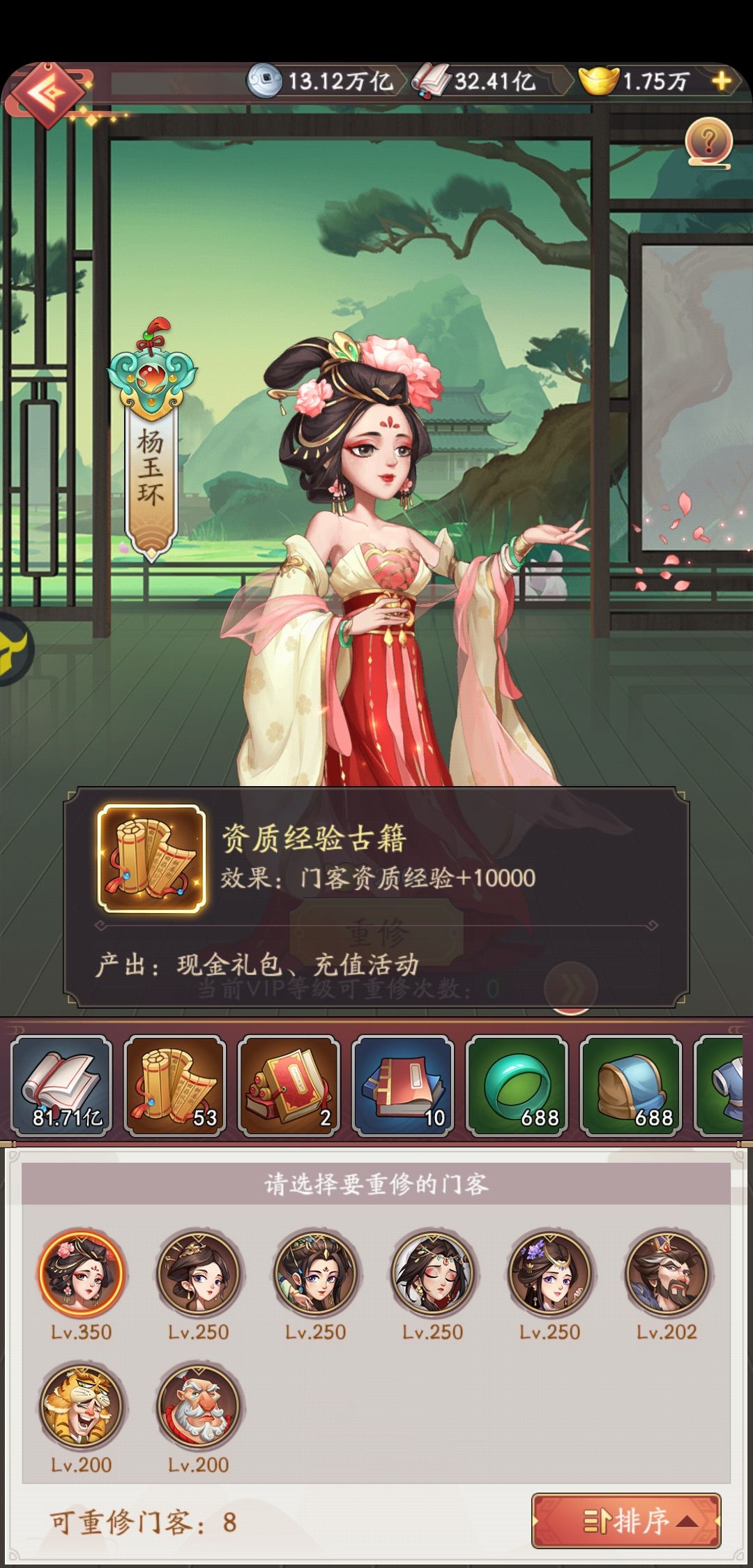 我第一门客选择了貂蝉,1星技能基本用卷轴和账房经验点满的,后期提升只能升2-6星技能,账房经验太慢,用卷轴成功率太低,我一般点5星技能,20%成功率,平均5-7个左右才提升一次。想主升一个财力提升很慢。现在重修,资源全部砸给第二门客杨玉环,第二门客300级,1星技能300级,财力1200多万,升级后可以继续提升50次,本来想继续升貂蝉的,腾出1星技能空间给卷轴,但是想了下其实差距不大,结果就这样了,继承了貂蝉的资源后,提升还不错。