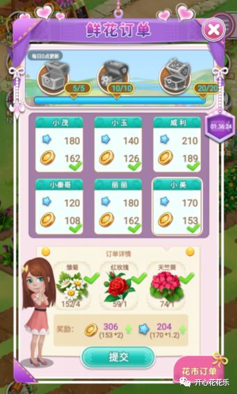 种植好的鲜花,我们可以用来完成鲜花订单、花市订单和制作成插花出售,每一次提交鲜花订单就能获得金币和经验值,当等级不断提升,我们就要可以开拓出更多的田地来种植鲜花。在插花方面,玩家们可以自由选择自己所拥有的鲜花进行搭配,插花的花瓶也会随着等级的提升开放不同样式的花瓶、花瓶花篮,同样出售的插花不同所获得金币也有多有少。