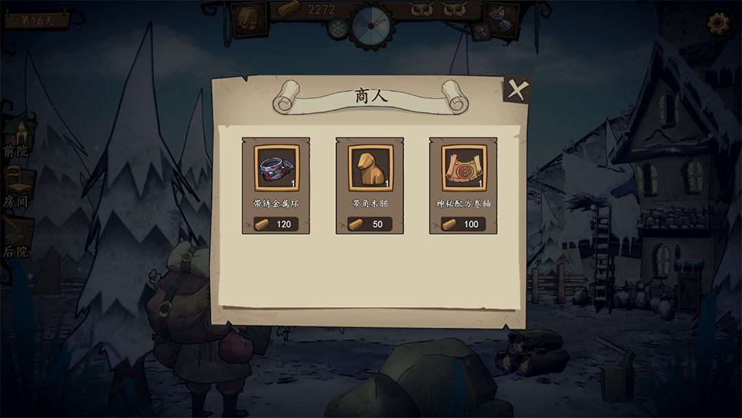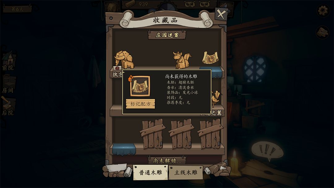 灯塔的后院偶尔会出现商人的身影,可以用木材兑换“神秘配方”。购买后开启木雕架上一个木雕的配方,上面会写清楚该木雕的必要条件——某某木胚/某某香水/某某装饰品/指定的时段/推荐的季节。