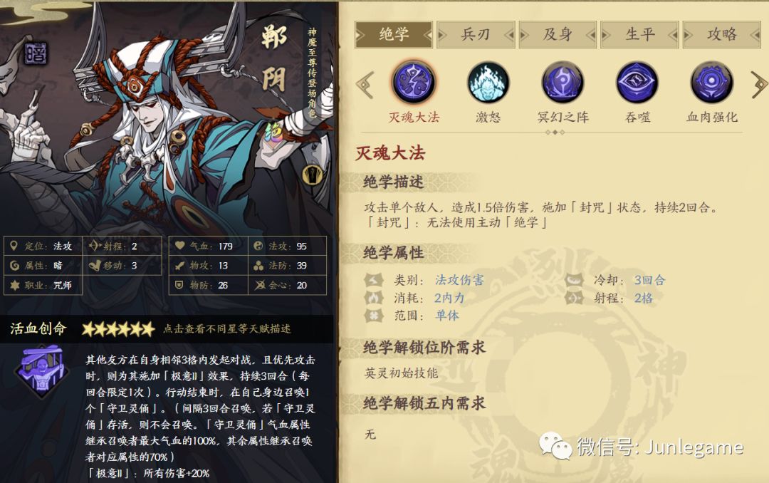 郸阴作为最强工具人3星就能用,pve攻坚视频已经有很多,这里不再敖述。PVP方面小僵尸第六人护卫挡刀&血肉强化&沉默禁疗等都很有用,目前暗系处于UP上升期,黎幽&剑邪&郸阴&韩无砂(未来大佬霍雍)暗阵已成型,光系目前只有一个驱散T宇韶容,克制暗系遥遥无期,暗系还可以逍遥很长一段时间。必抽种,家里有矿请抽到6星质变。