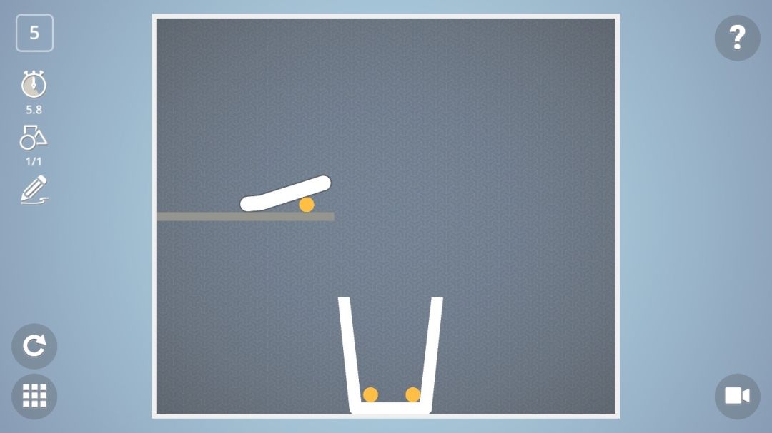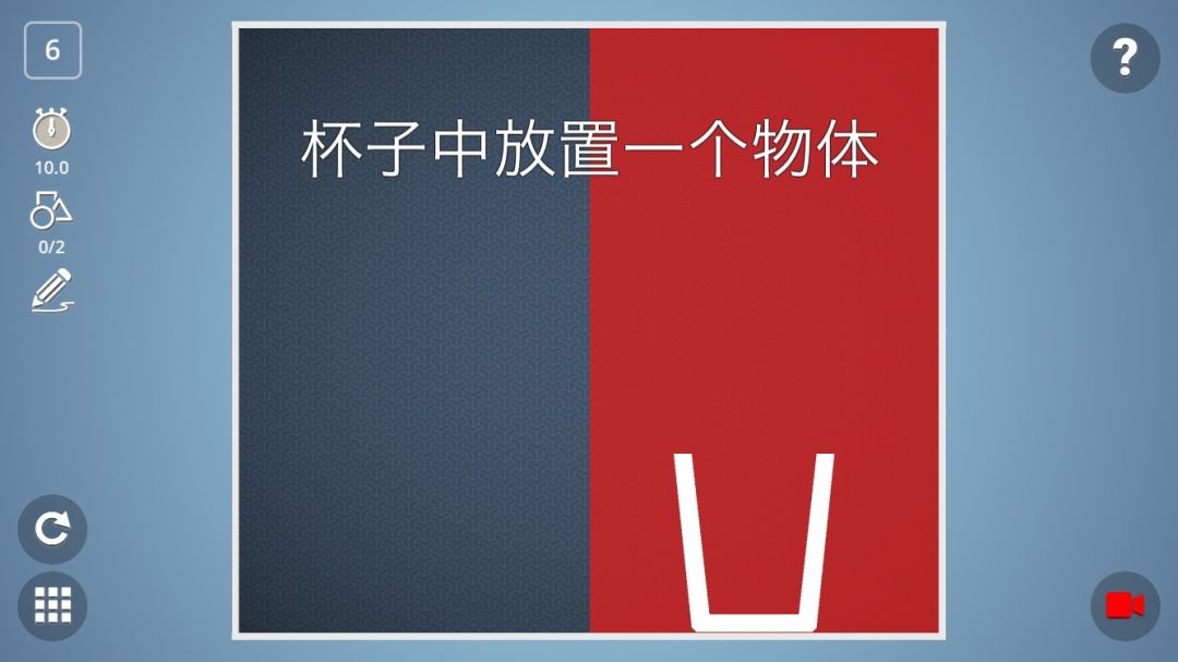 最一开始的关卡都比较好解决,可是随着游戏的进行,一些奇奇怪怪的过关需求就出来了,比如这一关,游戏要求玩家在杯中放置一个物体,红色部分是不能画东西的,那么常规想法是在左边的灰色区域画一个滑道,然后再画一个球滚进杯子,因为滑道没有支撑的位置,根本不能稳定地站起来,所以在好多次尝试后换个角度看,其实只要画一根镰刀样的棍子,倒下来的时候镰刀头在杯子里不就好了么?