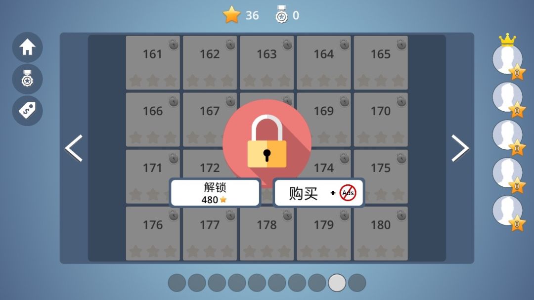 游戏有整整180个不同关卡供玩家选择,当然关卡开启是有条件的,玩家只有玩到了一定的星数才能解锁之后的关卡,每一个关卡都有三颗星的判定,玩家符合“完成关卡”“在规定时间内完成关卡”“在规定笔画内完成关卡”这三个条件其中的一个就能获得一颗星,如果三个条件都符合的话,就可以满星过关了。初期的关卡难度不高,所以在这些关卡里刷一些星星,对解锁后面的关卡有着很大的帮助。