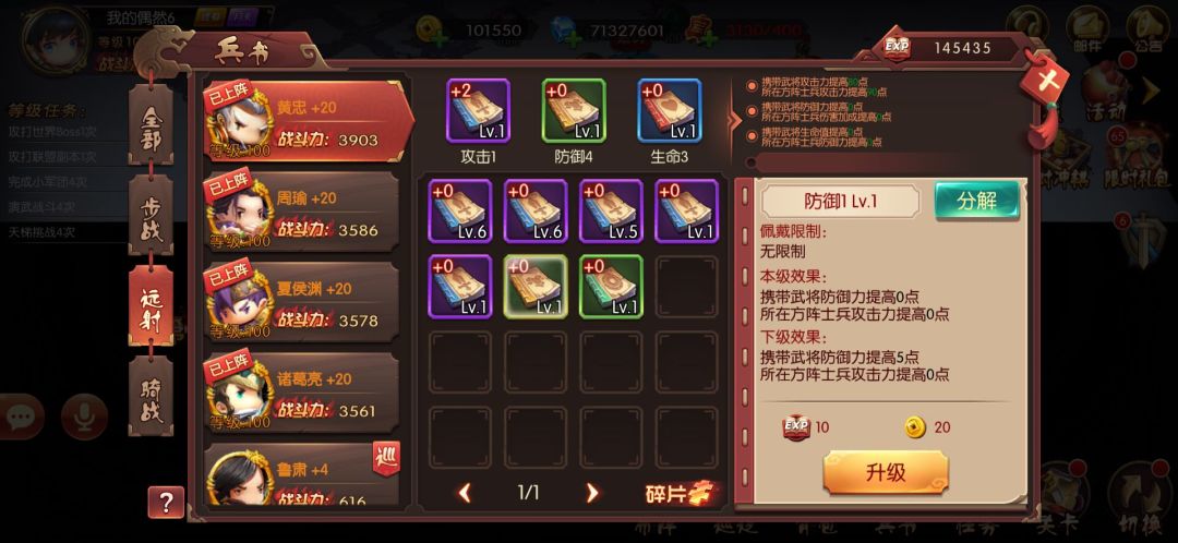 每种兵书将会提高武将的5种属性之一:血、攻、防、增伤、减伤