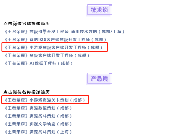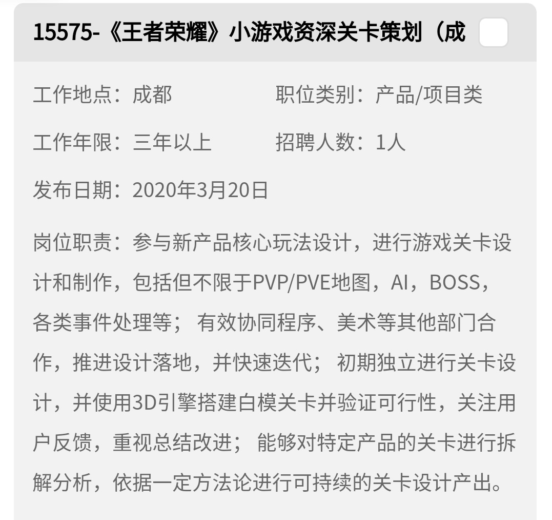 今日,葡萄君发现微信号「腾讯成都招聘」发布了一则天美L1工作室的招聘信息,其中首次出现了《王者荣耀》小游戏的相关岗位。包括《王者荣耀》小游戏高级客户端开发工程师,以及《王者荣耀》小游戏资深关卡策划两类。