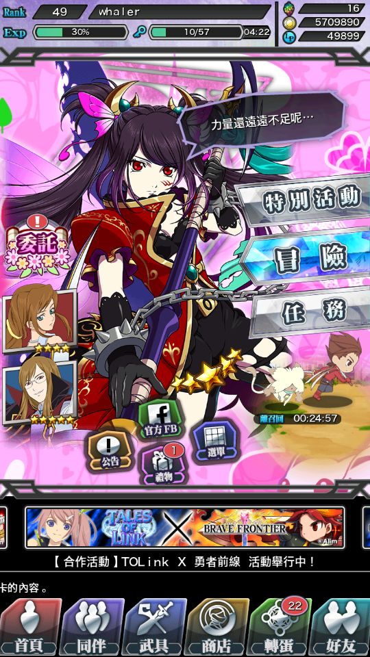 好吧,上次我们说了tol,也就是TALES OF LINK,羁绊传说,本人花了整整一周的时间总算是刷出了一个还不错的阵容,喜欢玩的可以加我一起玩~