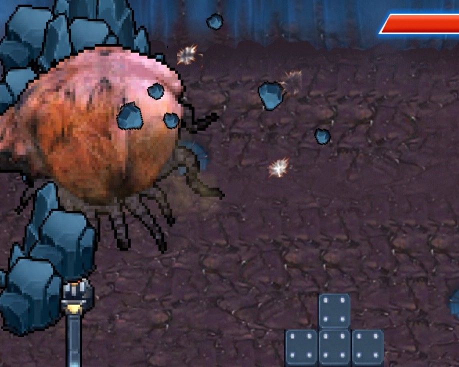 特殊的两种怪物,一个是自爆蓝虫子,杀掉就行,一个是突然出现并且多个子弹的鬼影,这关过去后的地方仍然可能出现怪物,打发是移动的时候注意左右移动,躲避鬼影的攻击,下图为这关最后的位置,推荐用激光等技能解决,否则子弹封路过关会很慢,移动也很麻烦。