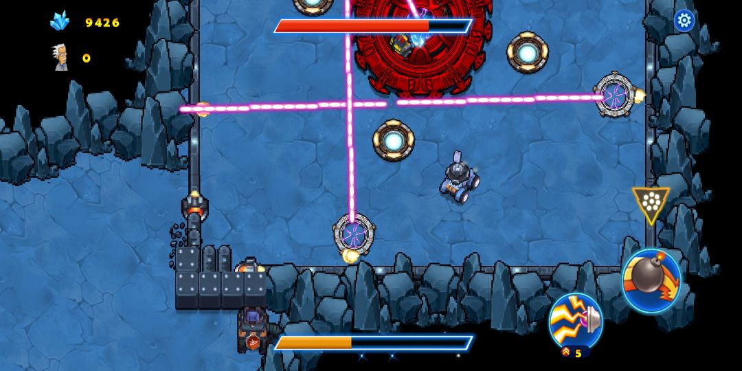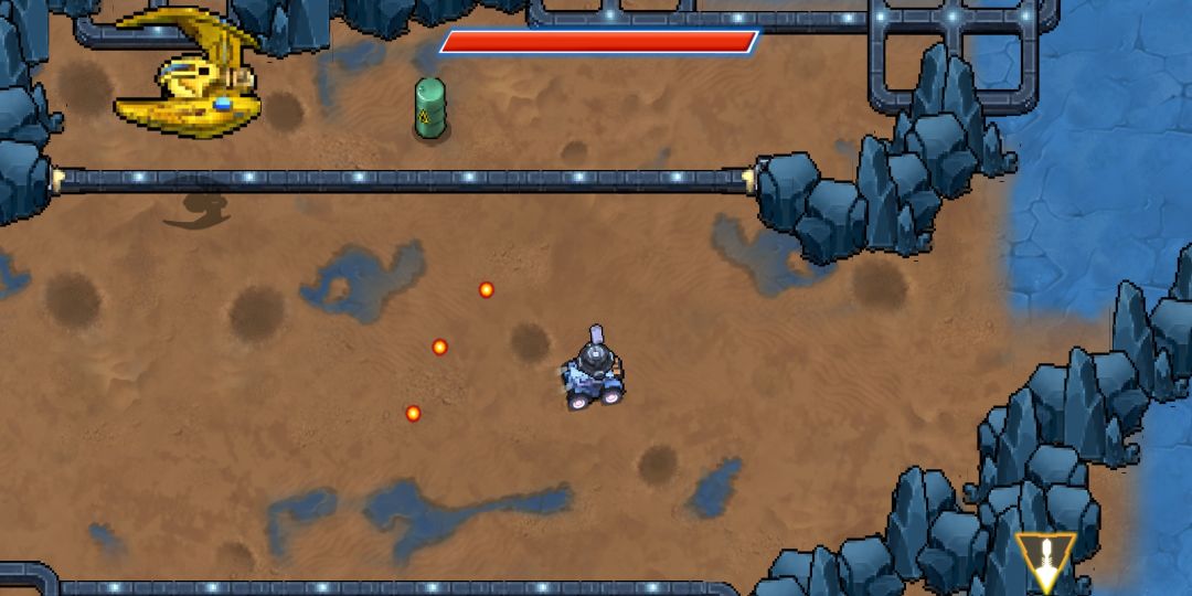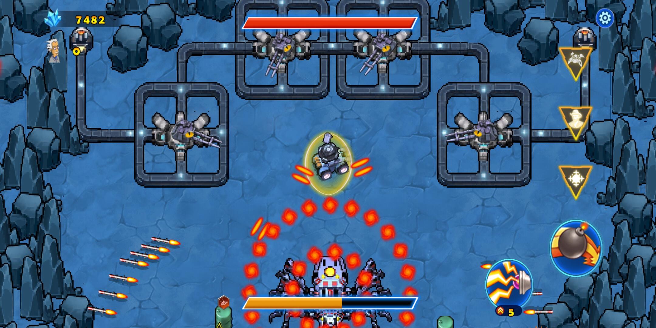 一架飞船和两侧炮台,技能有激光,上下子弹,上下子弹位置会有蓝色提示,躲开就好,这个boss只需要在一侧打掉炮台就可以了,然后在他不发激光时往一旁靠靠,否则离近了激光有可能会刷在脸上,也可以把两侧炮台都打掉,就只有boss的激光和上下子弹了。