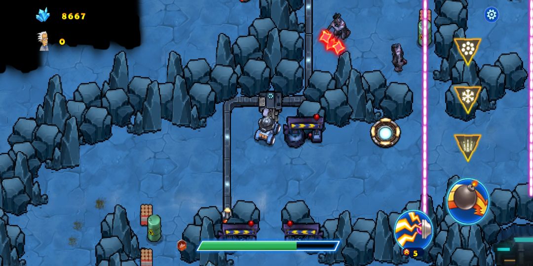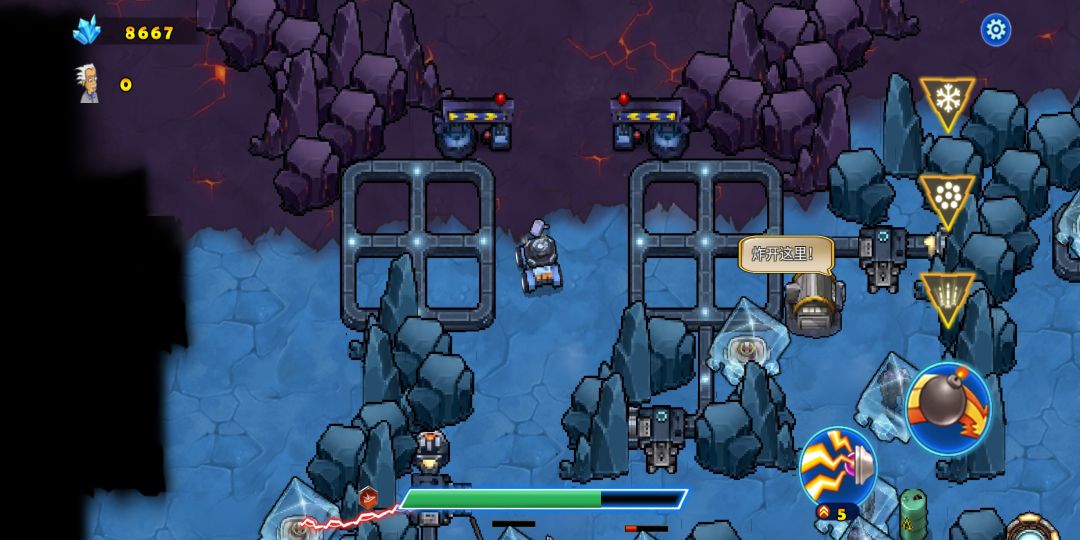 第五关 这关比较吃技能,需要的技能有寒冰,护盾,激光。如果没有这些过图需要打很肉的远古刺蛇和变异人。地图有冰冻的电枪,用炸弹可以解冻协助打输出,路上会有红色激光,需要通过圆盘挡住通过或者使用炸弹攻击发射机解决,发射器也可以通过寒冰,激光解决,这关最后的位置如果没有上述技能,则需要一个个清发射器,如果有,可以控制后无激光时通过,下图有变异人的那条道路是通关道路。