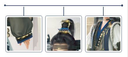 主体款式为男性直裰长袍,为了突出机巧学者与普通文人的差别,袖口和长袍、外搭都进行了束口和删减设计,使其更加方便走动劳作,头部造型参考了明朝男子常戴的网巾,突出精干的形象。