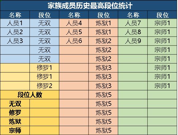 开始安排时需要对家族整体实力进行了解,可以按下表统计一下家族33段位