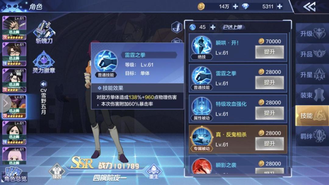 卯之花烈:此人物适用于一切物理输出、被动提升15%攻击和6星额外10%的暴击成让夜一更加如鱼得水,普通技能的范围眩晕更是让夜一的生存大大的提高。