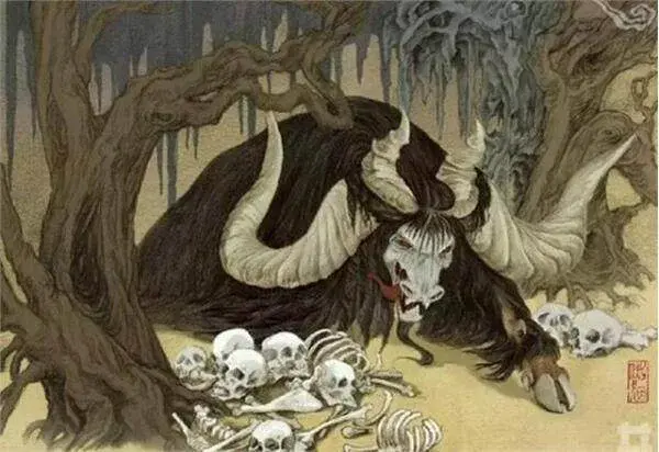 其上有兽焉,其状如牛,白身四角,其豪如披蓑,其名曰獓彳因,是食人。