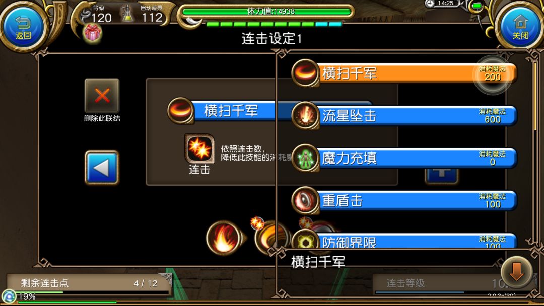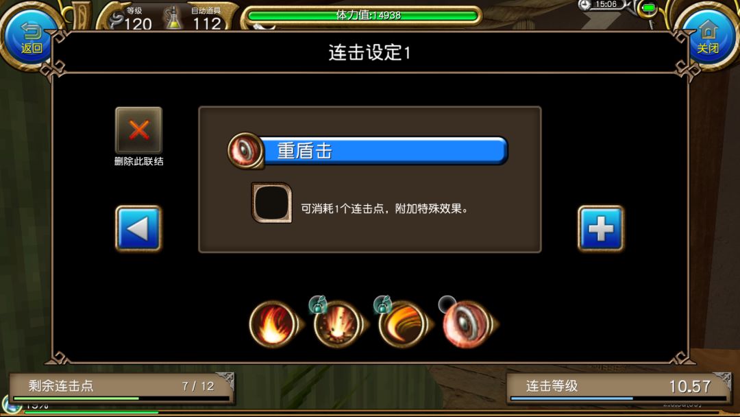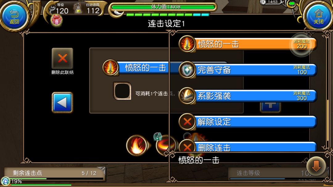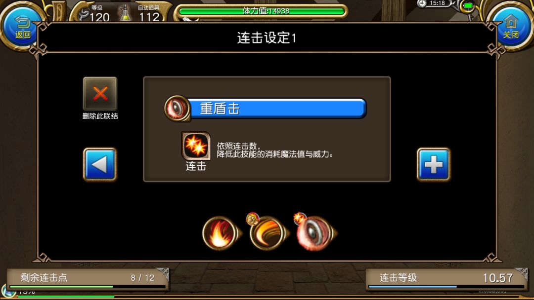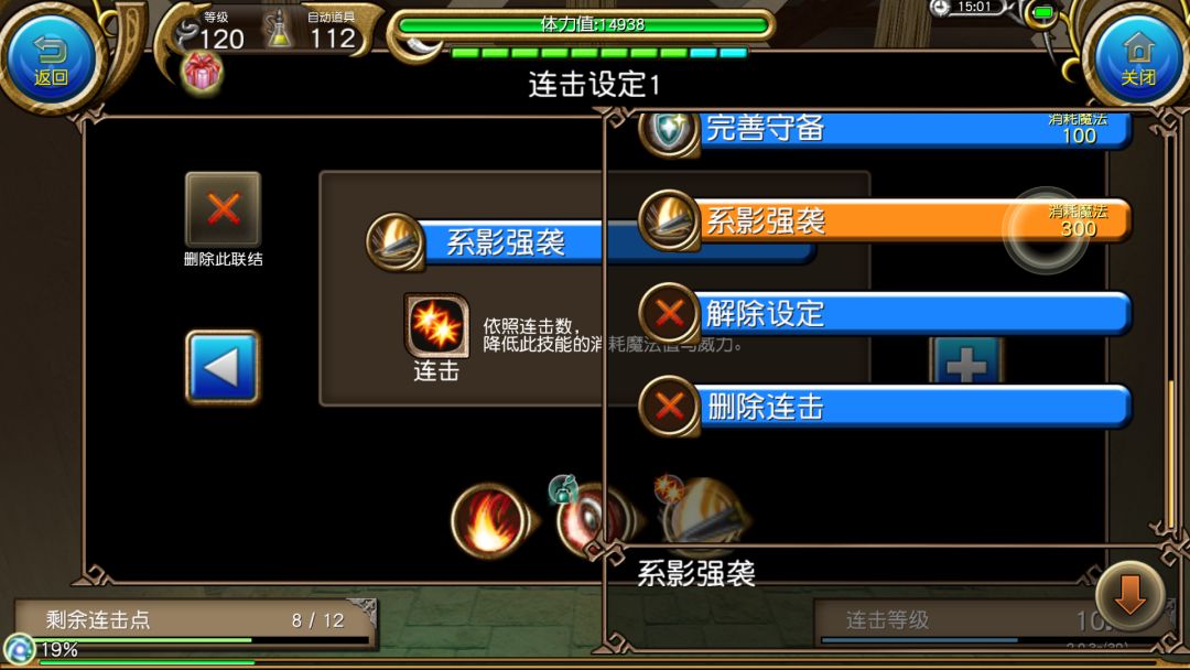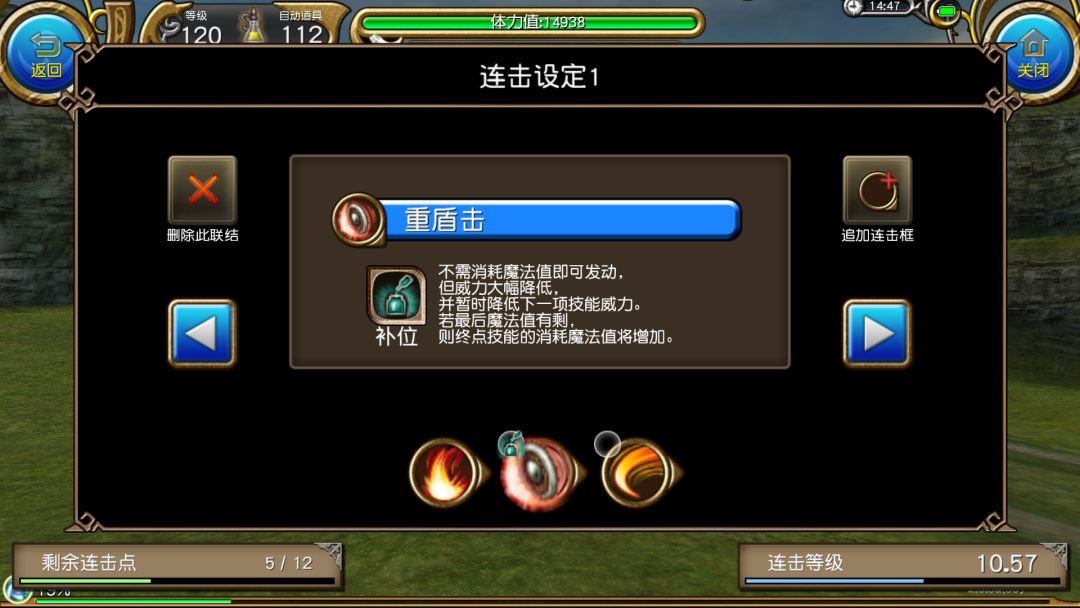 使用威力攻击后第一个框框内的迅捷攻击,这里可以看到它本来是100的蓝耗,但是有了<连击>,它的蓝耗就会变为0,从而本连击只会消耗1蓝(也就是100蓝/一格蓝)