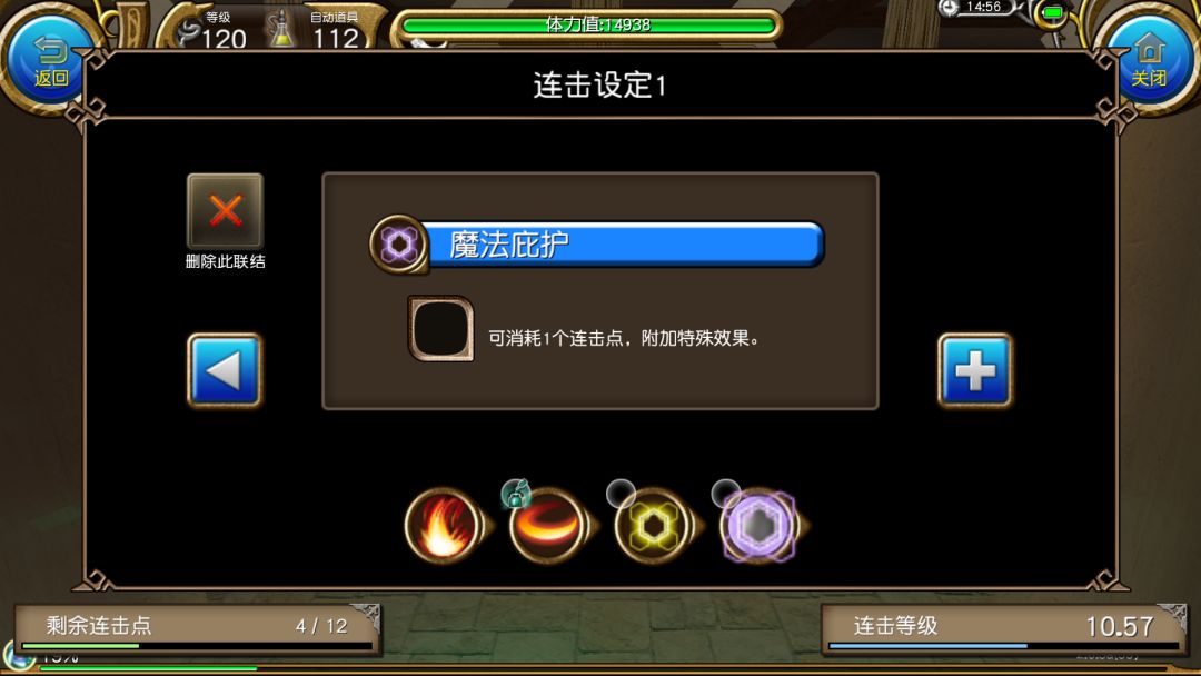 可以看到,第三个框的连击可以抵消魔法值2,也就是说,咱们放进去的第三个技能,只要消耗的魔法值低于等于2,那么本连击的蓝耗依旧会是1蓝。但是会降低第三个技能20%的威力。