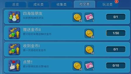 而社交类中的成就则比较多样化,你可以尝试:加更多的好友,给好友送金币,或者是点赞,达到一定的次数就能获得系统送出的金币奖励。比如赠送金币这里,+2姐已经达成I级成就了,现在正在完成II级成就,赠送50次金币。(P.S. 在系统中送金币是不会耗费自己金币的哦~)